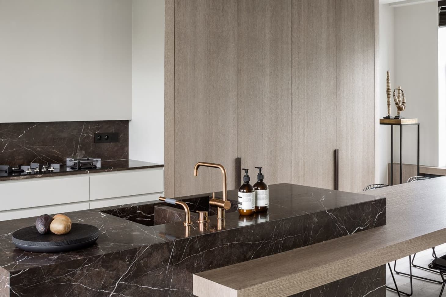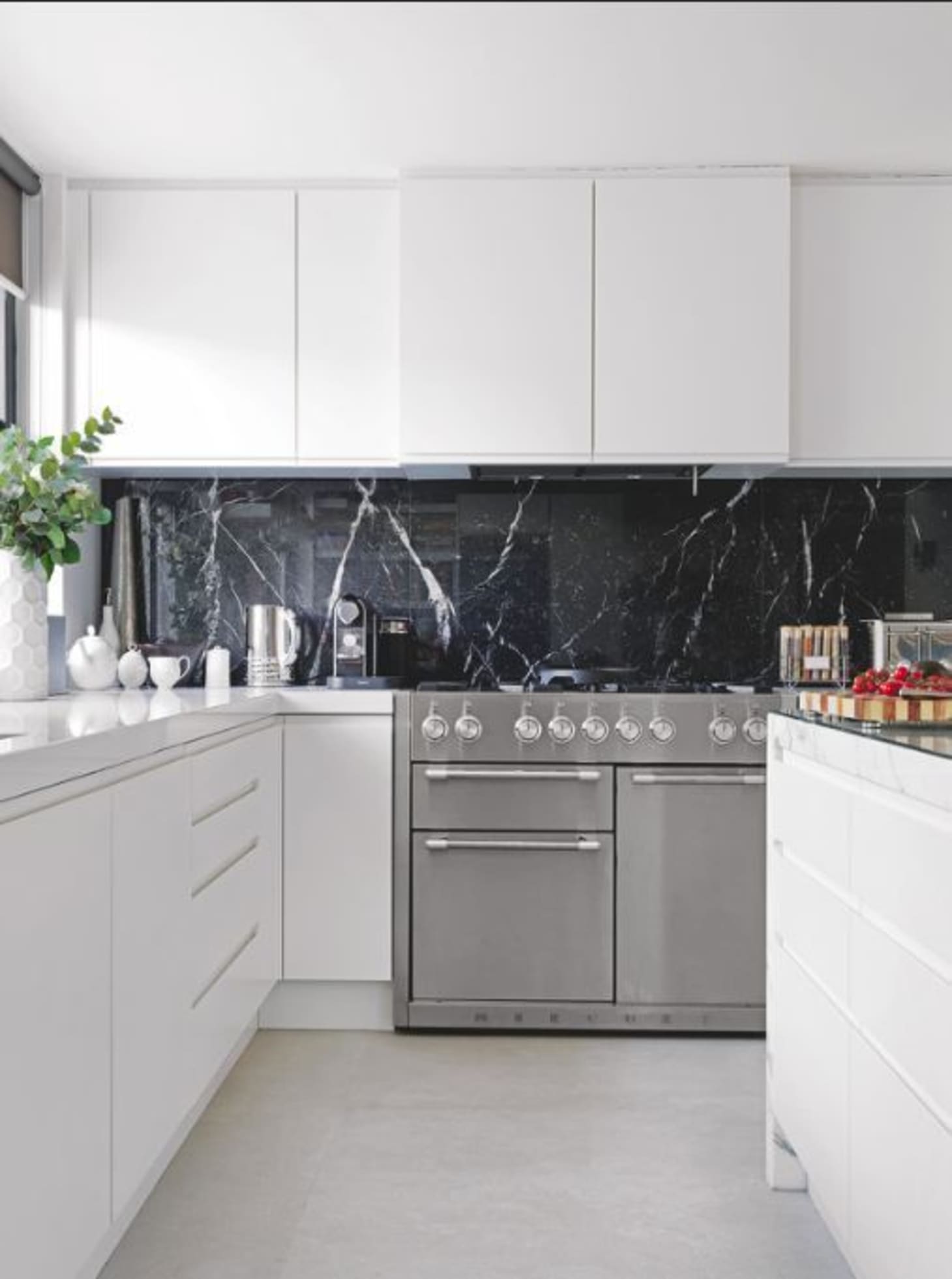 white kitchen with black marble